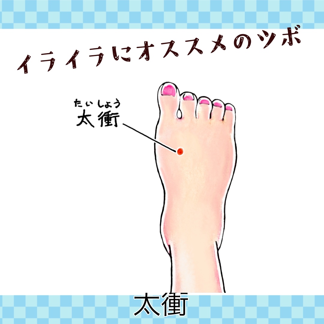 本日はイライラした時にオススメの太衝というツボをご紹介。
