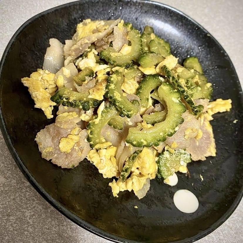 いっぽで育ていたゴーヤを収穫して食べました。