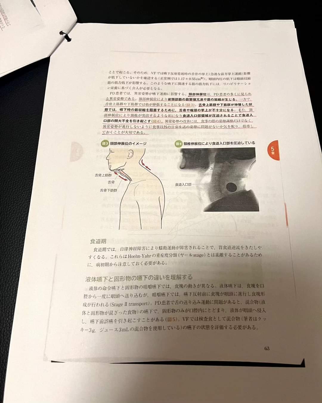 基本的なパーキンソン病患者の症状や、姿勢異常による摂食嚥下機能の評価、障害について学びました。
