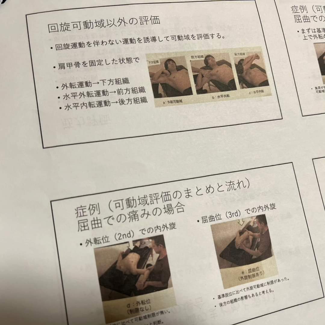 今回は肩甲骨と上腕骨との関節や、肩甲骨と胸郭との関節を中心に関節の可動域や筋力の評価について学びました。