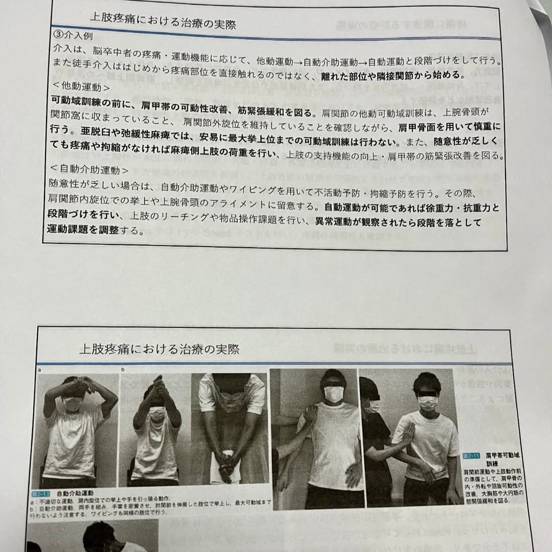 片麻痺患者の疼痛発生しやすい部位や、痛みのメカニズムについてなどを学び、その後に疼痛に関連する評価について学びました。