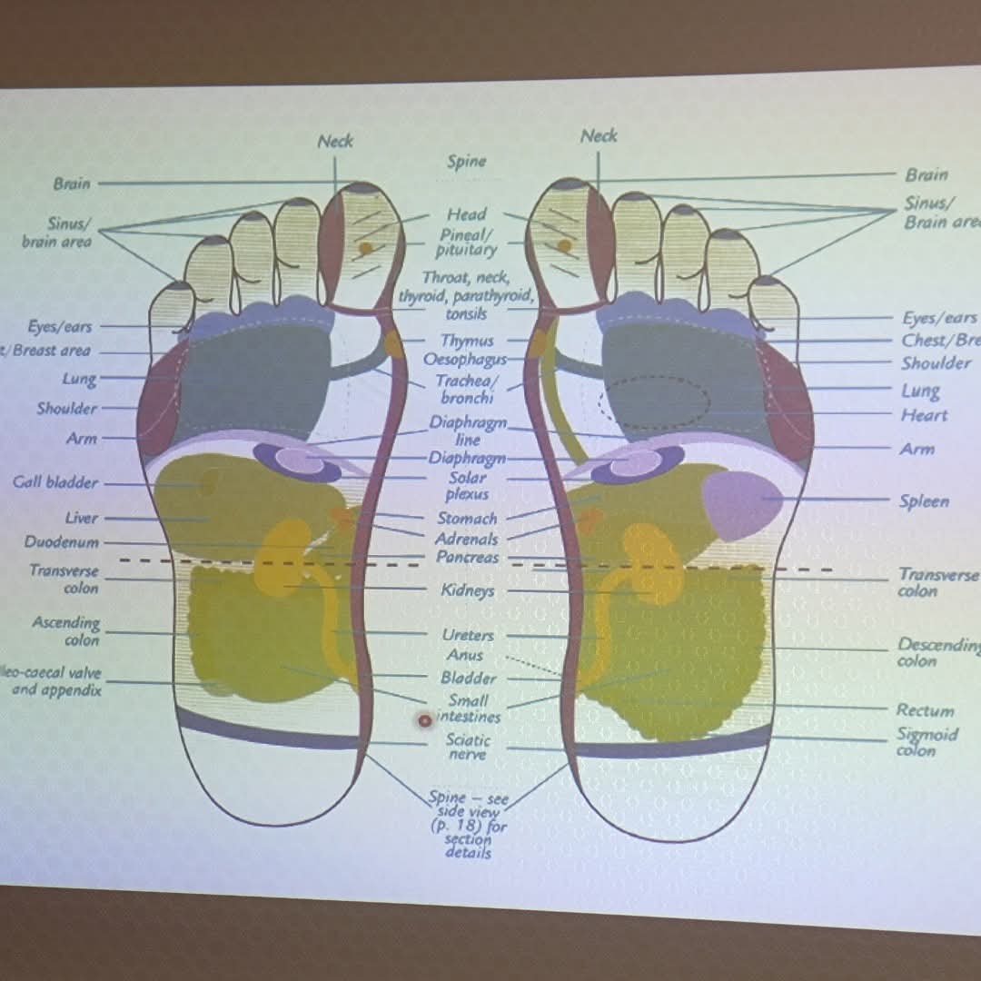 今回はリフレクソロジーの歴史や理論を確認して、実際に足裏に対しての施術を行いました。身体の部位、内臓などと関連しているエリアは、押圧すると痛みを感じるところもあり、自覚症状と一致する部位もあったので施術を受けていておもしろかったです。