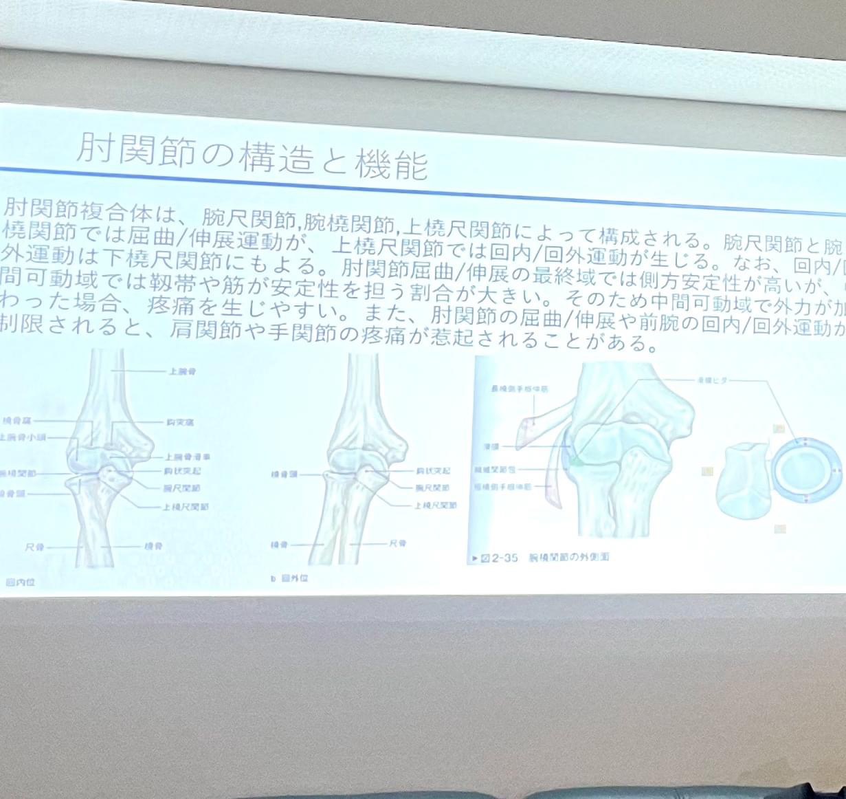 基本となる構造や機能の復習や内側と外側の痛みがどのような要因で起きているかなどを中心に学びました。