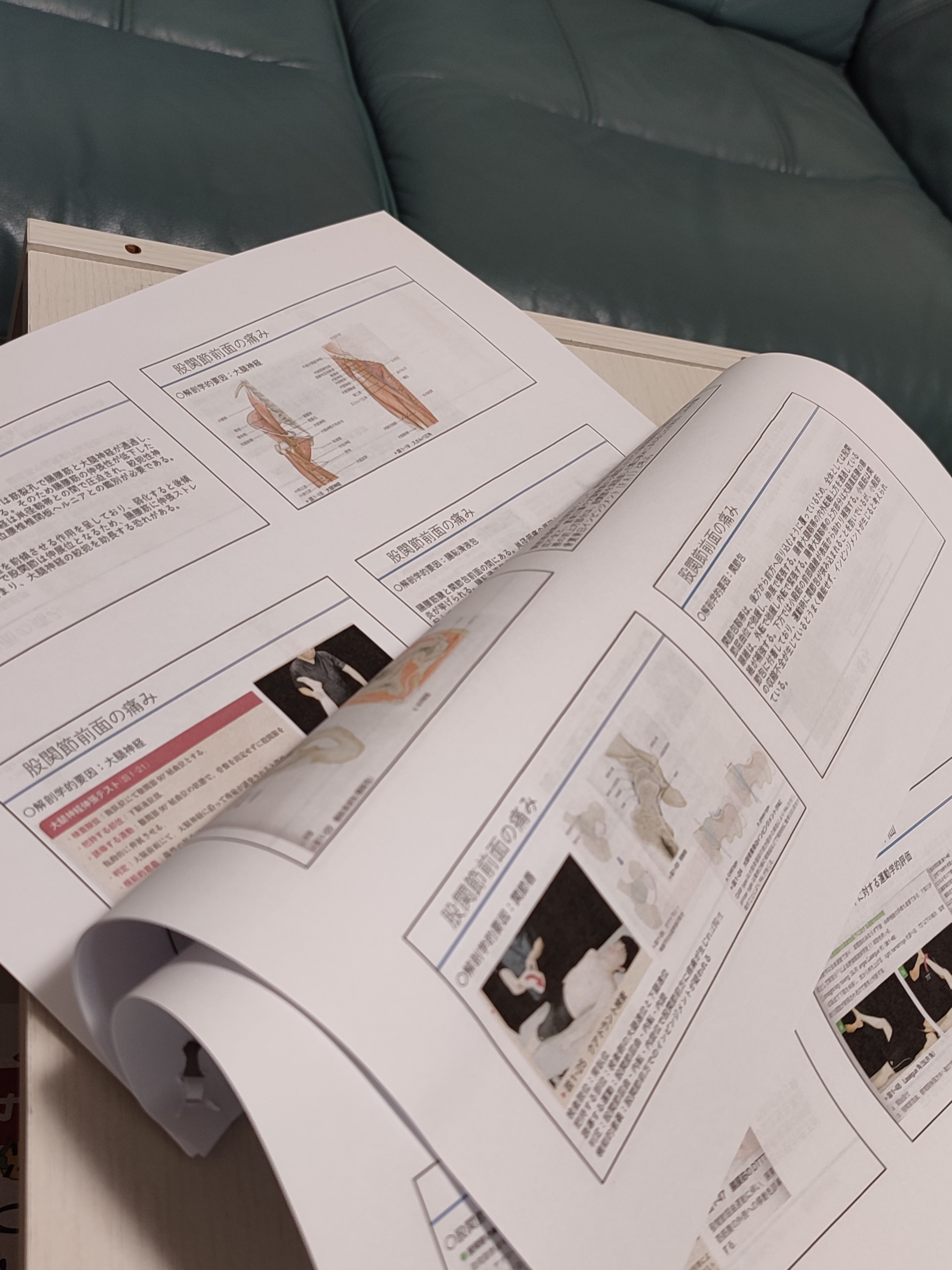 股関節の構造と機能を確認して、股関節の前面や側面といった部位ごとに生じる痛みを、さらに筋や骨など起因がどこからなのか細分化していきながら考察を進めました。
