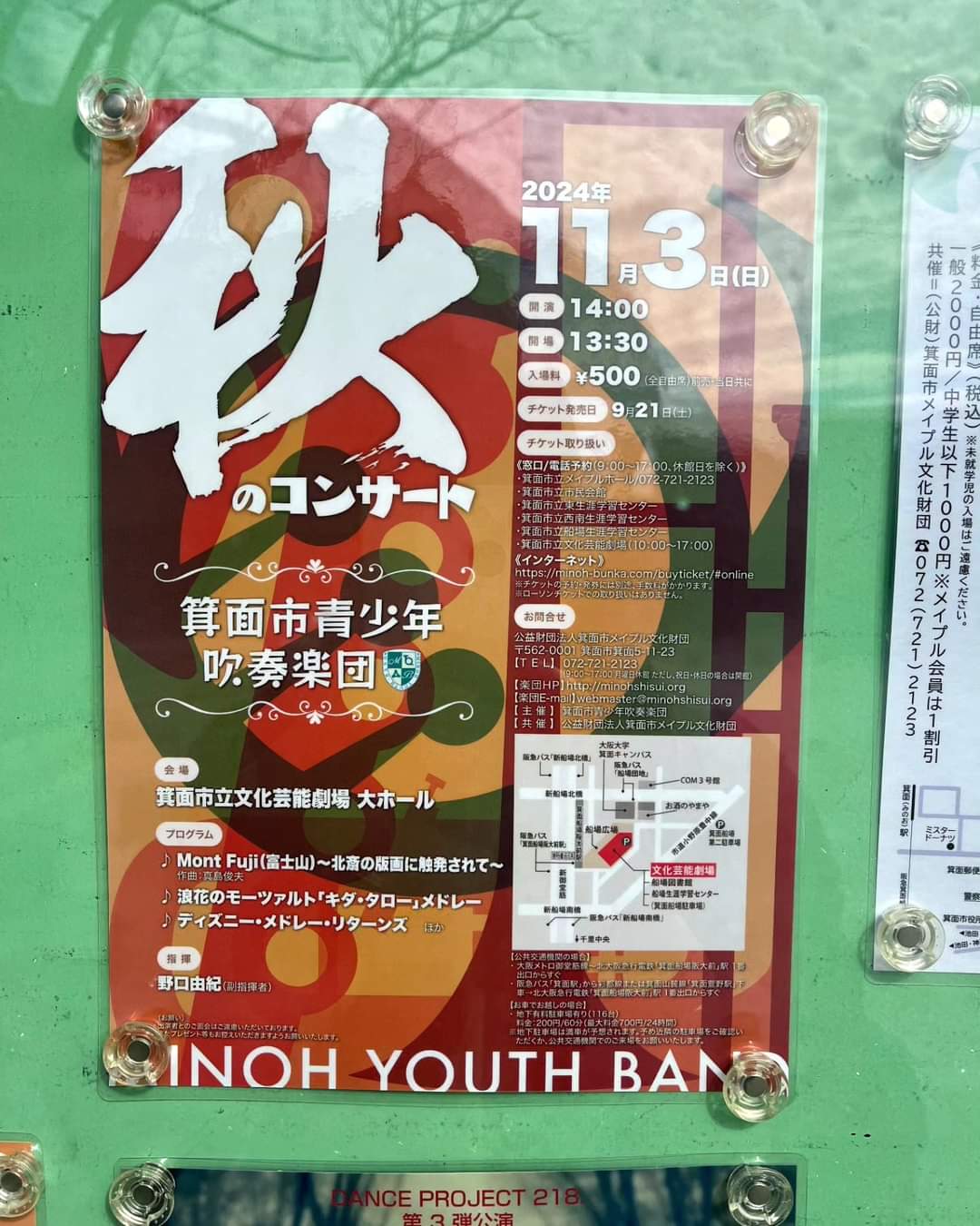 11/3に箕面市立文化芸能劇場で箕面市青少年吹奏楽団によるコンサートがあるそうです。