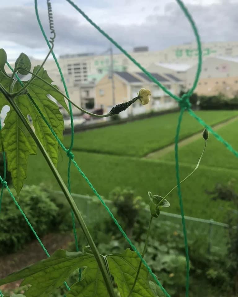 花の手前には小さいゴーヤがなってました。