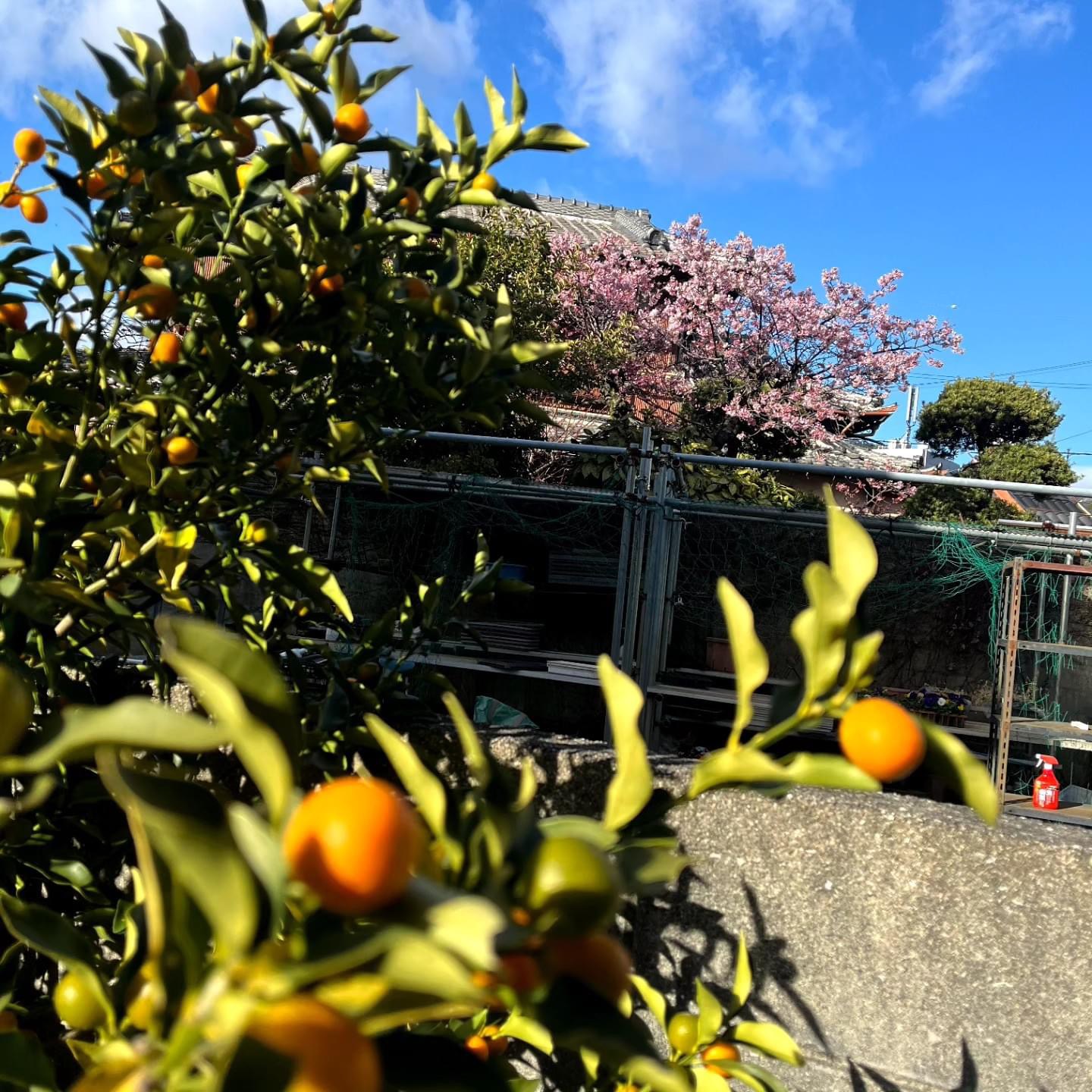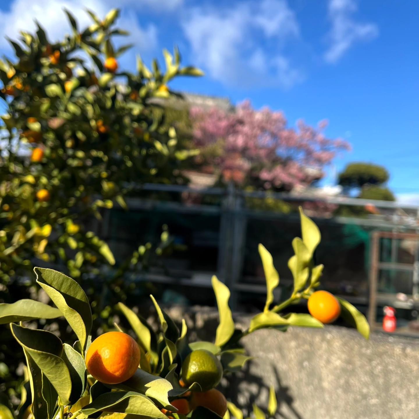 訪問先に金柑がなっていたので撮影させてもらいました。何気なく撮ったら背景に早咲きの桜が咲いていました。金柑と桜にピント合わせて2枚撮ってみました。