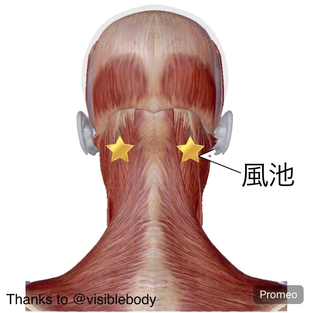 頭の後ろ、髪の生えぎわで、筋肉の盛り上がりの外側の凹みにあります。両親指の腹をあて、強めに押し込みましょう。頭の重みを利用する為に、親指を当てた状態から、軽く顎を上げると押しやすいです。ホットタオルで温める方法もあります。