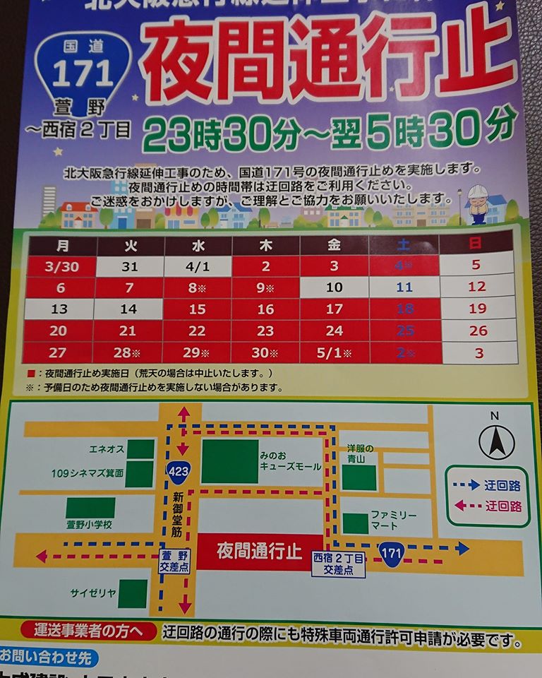 夜間通行止めのお知らせ 夜間通行止めのお知らせ 4月のほとんどの日で、国道171号線と新御堂筋が交差する辺りで夜間通行止めが実施されるようです。 PR コメント コメントを書く コメントを書く コメント送信