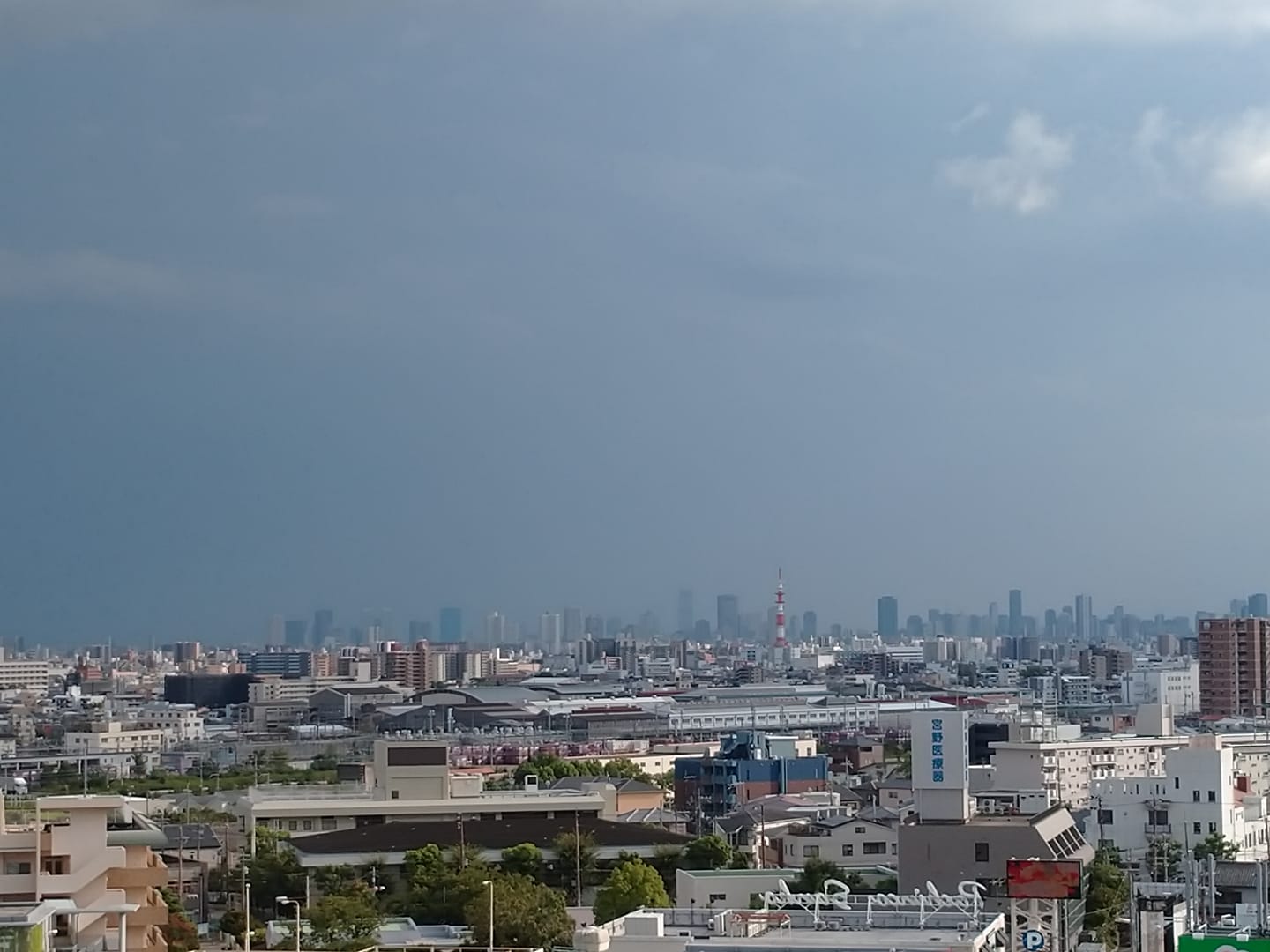吹田から南方向を望むと、あべのハルカスがかすんでる。
