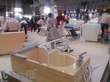 インテックス大阪の1号館から5号館までを使った広い会場内で、介護用品や自助具、介護食品などから、