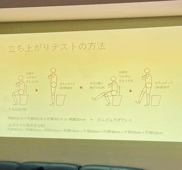 勉強会では評価方法をいくつか、自分たちで試してみました。立ち上がりテストでは、40cmや20cmの台からの片脚立ちをしましたが、思ったよりも立ち上がれなくて筋力が弱くなっていることを実感しました(笑)